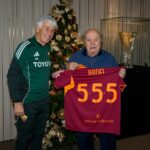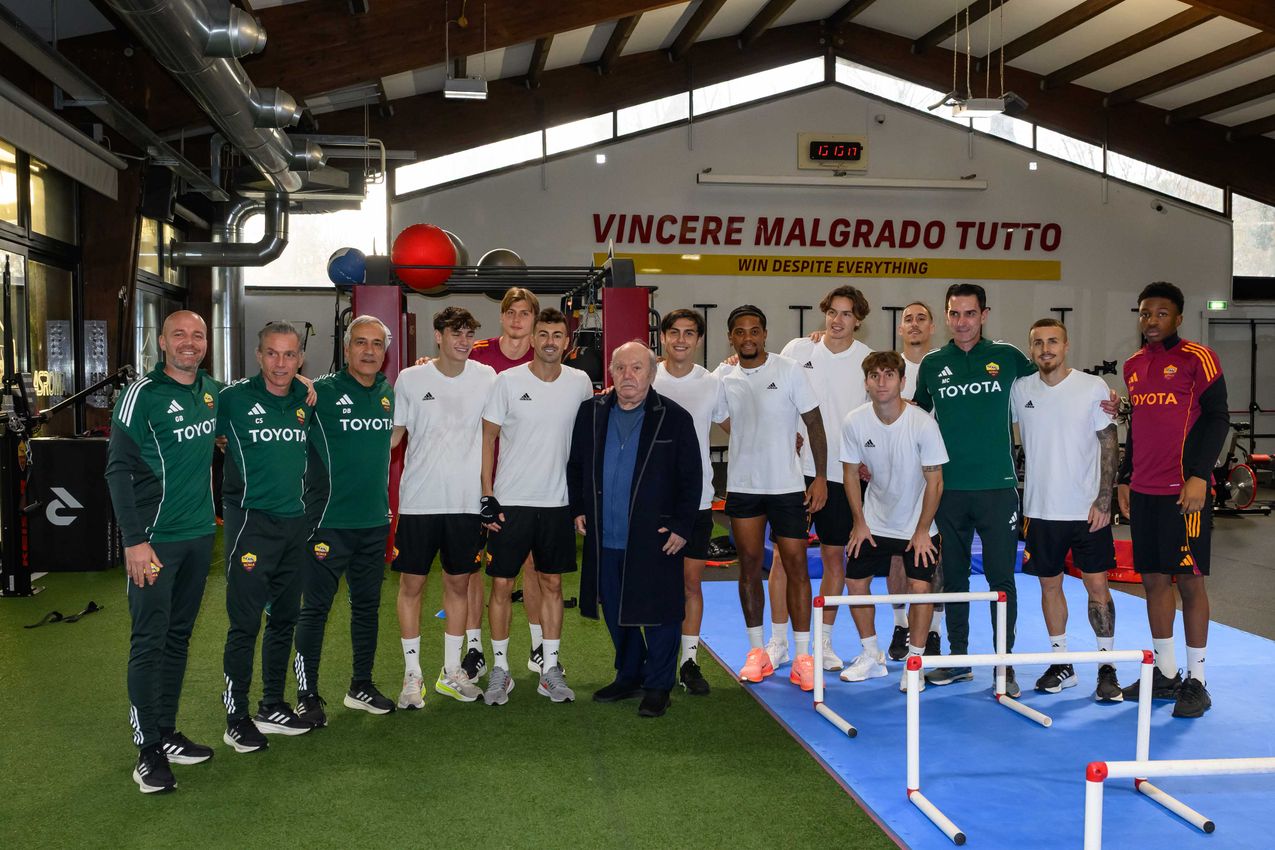 L’appello è stato raccolto e così l’attore pugliese Lino Banfi è stato ricevuto nel Centro Sportivo Fulvio Bernardini dove gli è stata riservata una calorosissima accoglienza da parte di tutta la squadra, dello staff tecnico e della dirigenza. Gasperini ha ricevuto in dono dall’attore la storica maglia della Longobarda di Oronzo Canà, l’allenatore “nel pallone” interpretato da Lino Banfi nell’omonimo film del 1984. Una pellicola diventata un cult per chi ama il calcio e che ha trovato tanti giocatori preparatissimi a suon di battute citate a memoria. Dopo l’incontro con Ricky Massara, Claudio Ranieri e Bruno Conti e una visita negli spogliatoi, Gasperini ha invitato Banfi a raggiungerlo sul campo per dare insieme l’avvio dell’allenamento e spiegare alla squadra la famosa tattica del 5-5-5 con il tono scherzoso e scanzonato che lo ha reso celebre. Non poteva quindi mancare una maglia della Roma personalizzata in dono, con il mitico modulo del film.