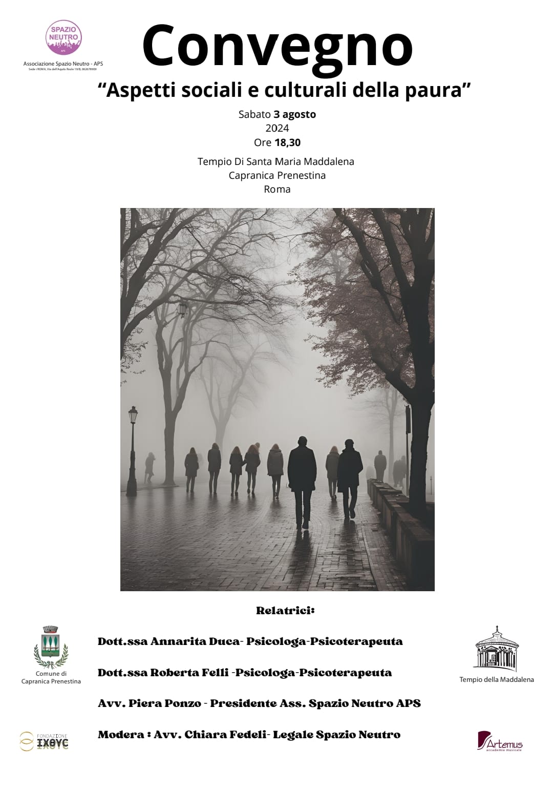 L’uso improprio ed eccessivo delle nuove tecnologie e le insidie che si celano dietro all’omologazione che in maniera crescente genera indifferenza sarà al centro dell’approccio Multidisciplinare del 3 Agosto a Capranica Prenestina. Le recenti analisi sociologiche hanno evidenziato l’urgenza crescente di fornire delle risposte concrete alla insicurezza, angoscia e solitudine di cui spesso sono vittime le nuove generazioni. Il Convegno di Capranica si pone l’obiettivo di fornire nuovi sistemi operativi al fine di implementare agli approcci già esistenti nuove linee guida di operatività territoriale. Nel quinto seminario della rassegna le Neuroscienze, la psicologia le scienze sociali ed il Diritto si troveranno di nuovo a confronto rapportandosi con tutte quelle sfide che “Le Molteplici Dimensioni della Paura” celano al suo interno. Affinché la vita non si trasformi in quel viaggio che troppo spesso rende gli uomini “invisibili” precludendone quella inclusione sociale divenuta priorità non più rimandabile. Citando Corrado Alvaro ‘La disperazione più grande che possa impadronirsi di una società è il dubbio che vivere rettamente sia inutile’ . Interverranno al Convegno Annarita Duca, Psicologa e Psicoterapeuta, Roberta Felli, Psicologa e Psicoterapeuta e l’avvocato Piera Ponzo, presidente Associazione Spazio Neutro APS. Modera l’incontro: l’avvocato Chiara Fedeli, legale di Spazio Neutro.
