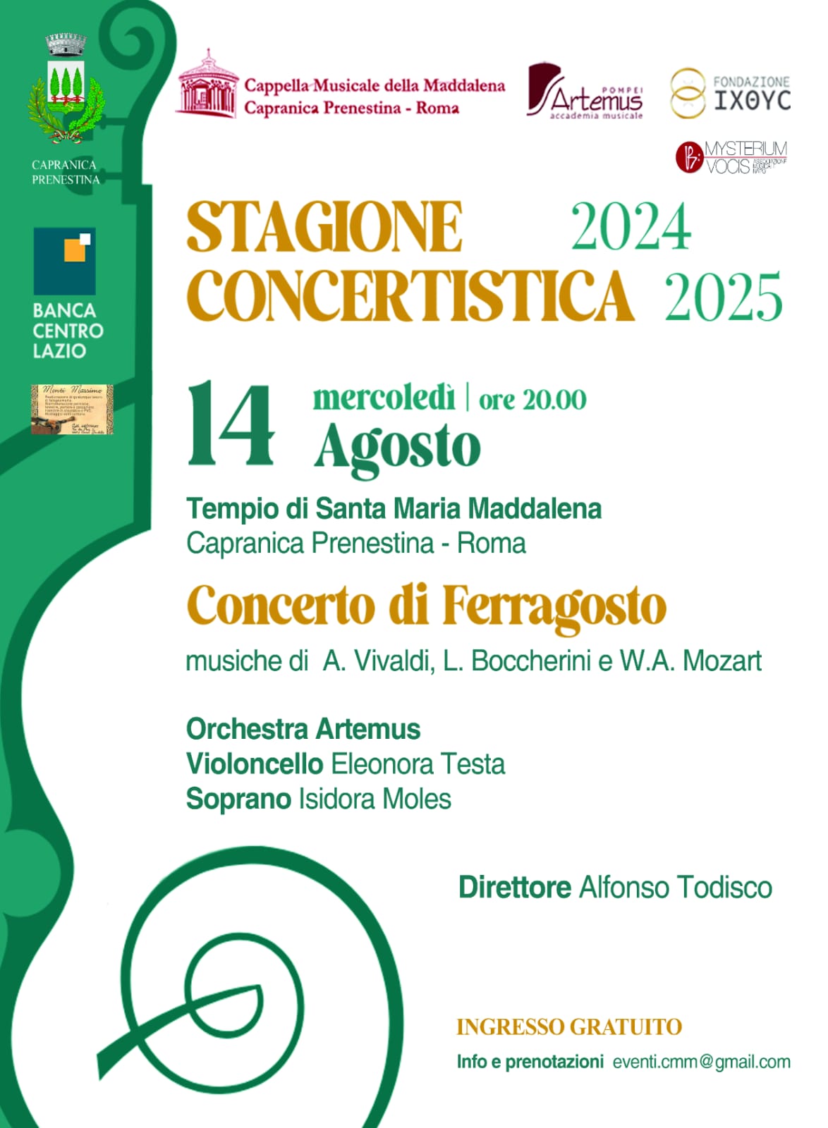 Presso il Tempio di Santa Maria Maddalena a Capranica Prenestina (Roma), si terrà il 14 Agosto alle ore 20 il tradizionale Concerto di Ferragosto. L’iniziativa porta la firma di Don Davide Martinelli, divenuto ormai un punto di riferimento non soltanto spirituale, ma culturale e sociale della Comunità Capranichese. Sarà ancora una volta Alfonso Todisco a Dirigere L’Orchestra Artemus per le musiche di A.Vivaldi, L.Boccherini e W.A.Mozart. Eleonora Testa sarà al Violoncello e Isidora Males  -Soprano affiancheranno il Maestro.