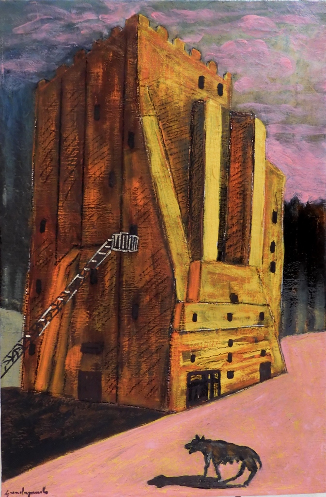 L’impalcatura come segno del tempo – Non meno significativa è la presenza dell’impalcatura dei vigili del fuoco. Guadagnuolo non la rimuove, ma la integra nella scena, trasformandola in parte della poetica dell’opera. Essa diventa testimonianza della fragilità del patrimonio e della necessità di intervento. L’artista non idealizza la Torre, ma la mostra nella sua condizione attuale, ferita e bisognosa di cura, trasformando il quadro in documento visivo del nostro tempo.