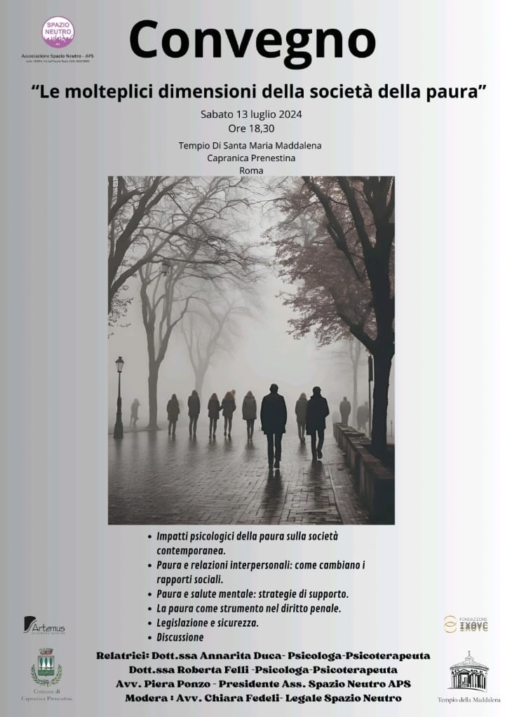 Ci si trova infatti ormai al cospetto di una emozione che interagisce con ogni variabile della nostra vita in grado di incidere pesantemente sia sulle nuove generazioni, ma minando le certezze anche di coloro che apparentemente apparivano più solidi nel substrato sociale. Al fine di fornire nuovi sistemi operativi e strutturali che non siano palliativi, ma efficacemente terapeutici,nel Convegno di Capranica, le neuroscienze, la psicologia, le scienze sociali e il diritto si confronteranno. Tentando di percorrere una strada innovativa volta ad arginare le diversità che “La Società della Paura ” pone in essere.