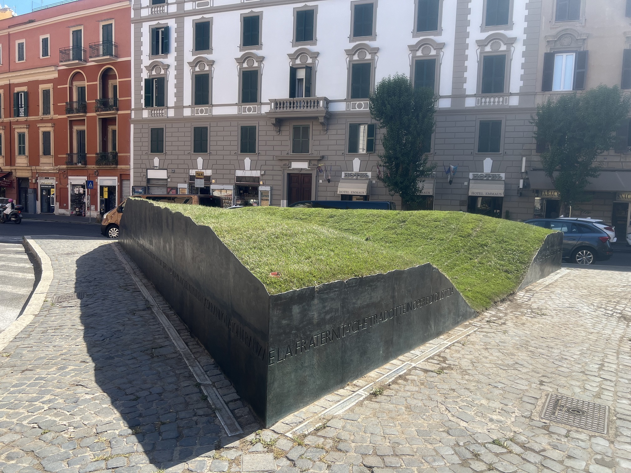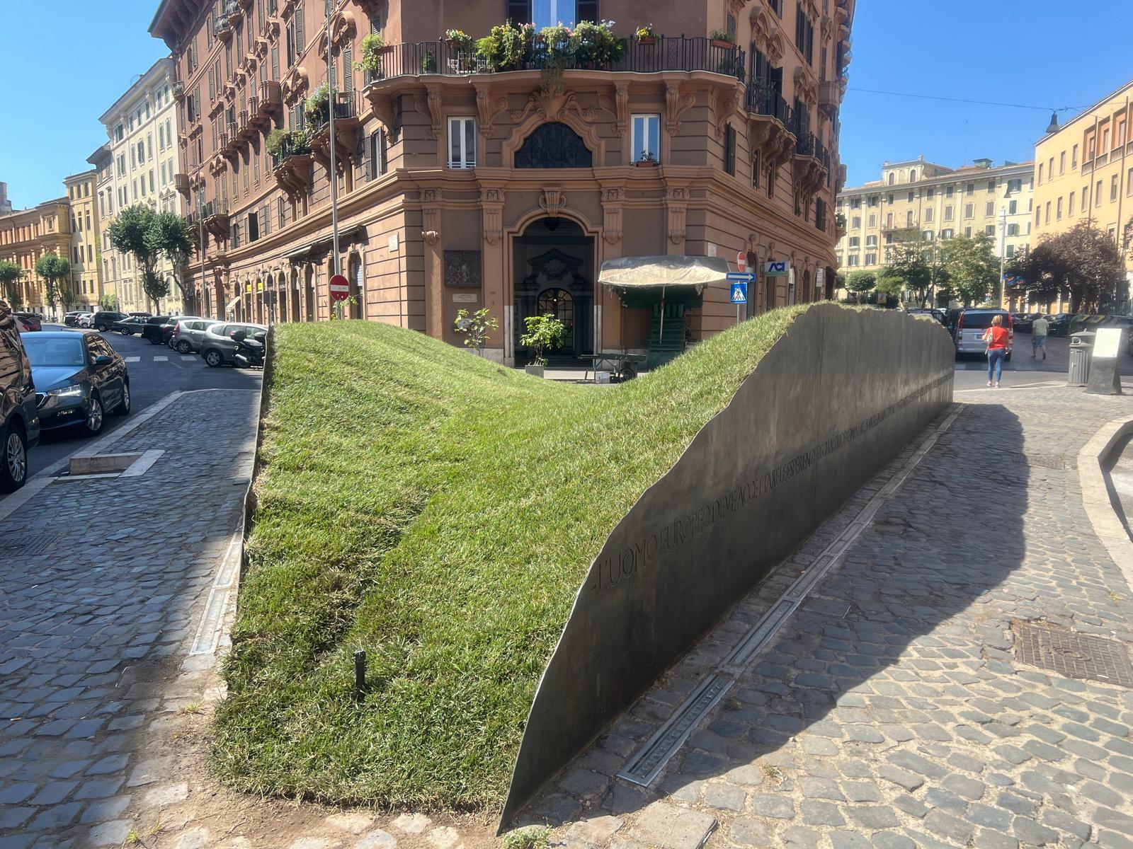 Nell’identificare lo spazio urbano con quello biografico di De Gasperi, Maria Dompè crea un’opera altamente simbolica, che trasporta idealmente nella capitale un frammento della sua amata terra d’origine e afferma al contempo la sua visione di Europa.