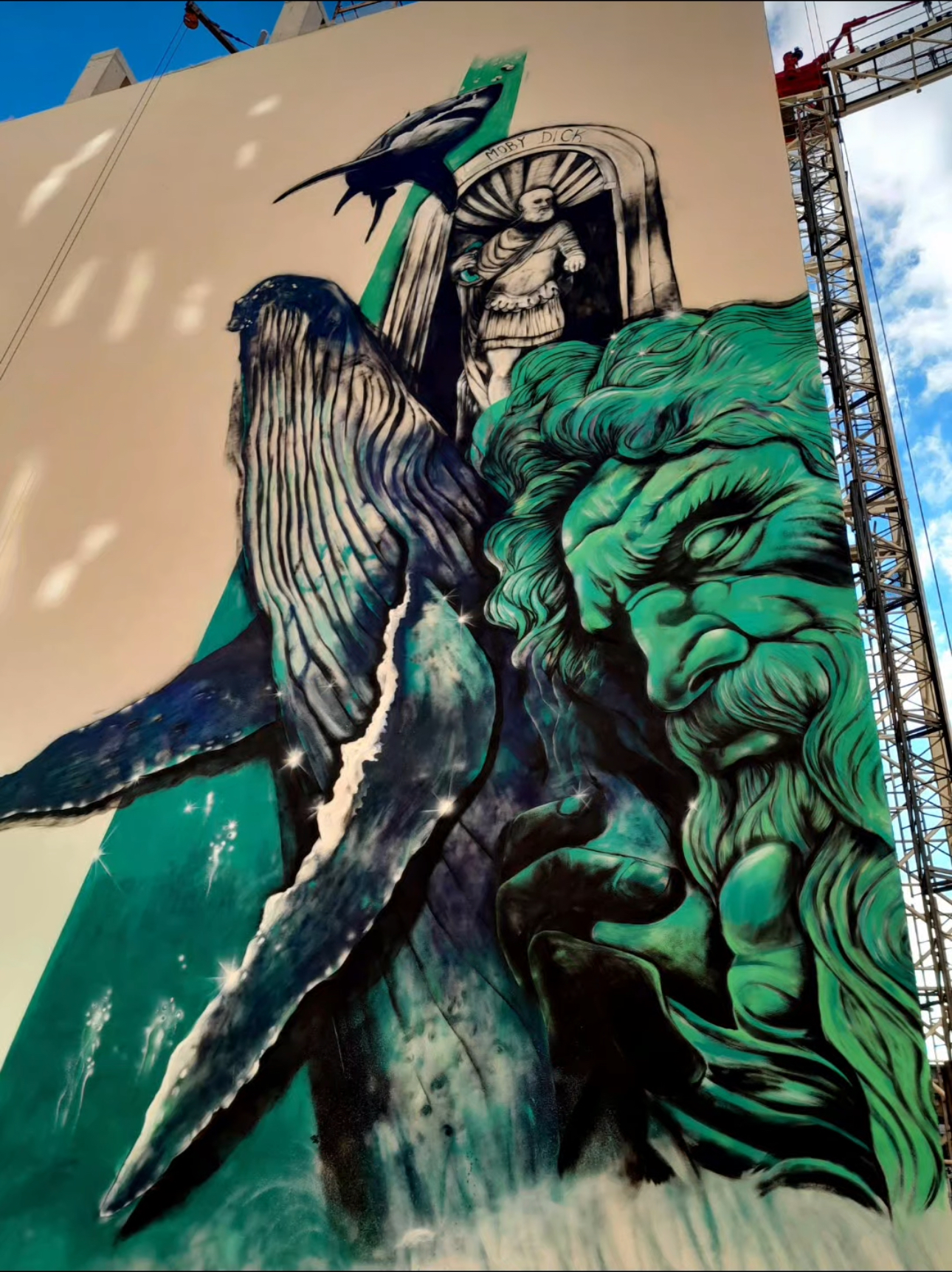 In via Antonio Meucci, il murale, ritrae una megattera a dimensioni naturali, sostenuta da Nettuno, Dio del mare, insieme a uno squalo bianco, si rivolge alla statua di Antonio Meucci, inventore del telefono, perché raccolga il suo messaggio.