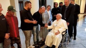 Anche questa mattina, informa la Sala Stampa vaticana, Francesco prima di imbarcarsi ha voluto, come ormai da lunga consuetudine, incontrare a Casa Santa Marta un gruppo di circa dieci persone senza dimora, “donne e uomini – si legge nel post su Telegram – che la notte trovano riparo sotto il colonnato di Piazza San Pietro o nelle vie intorno”, accompagnate dal cardinale elemosiniere Konrad Krajewski.