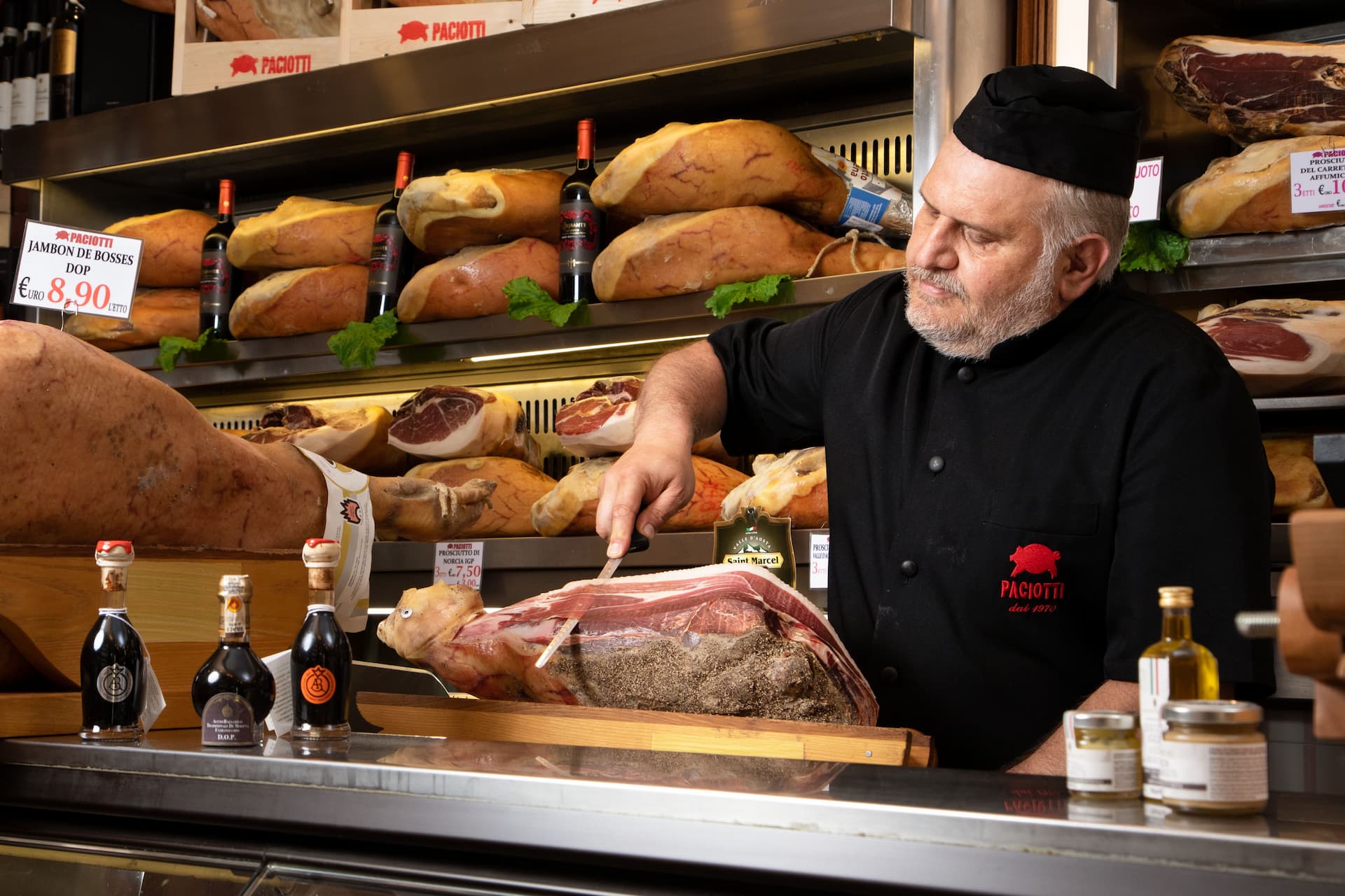 Paciotti ha inventato e ricettato a livello industriale, insieme all’azienda torinese, il prodotto grazie ad una partnership al 50% tra Italia e Spagna. “Abbiamo fatto importare la materia prima, cosce di suino iberico razza pura e a Torino, con l’artigianalità e le conoscenze italiane, è stato trasformato in prosciutto cotto”, spiega. “L’ho presentato al ministero degli Esteri e nella platea c’era l’assistente personale del Papa, che mi ha proposto di farlo assaggiare al Santo Padre. Il 7 luglio lo ha assaggiato a pranzo e dopo mezz’ora è squillato il telefono in salumeria. Era lui”.