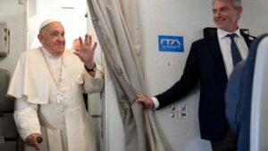 Papa Francesco, durante il viaggio verso l’Indonesia, a bordo di un aereo Ita Airways, ha compito il consueto giro di saluti e battute con gli 80 giornalisti di tutto il mondo che hanno volato con lui.