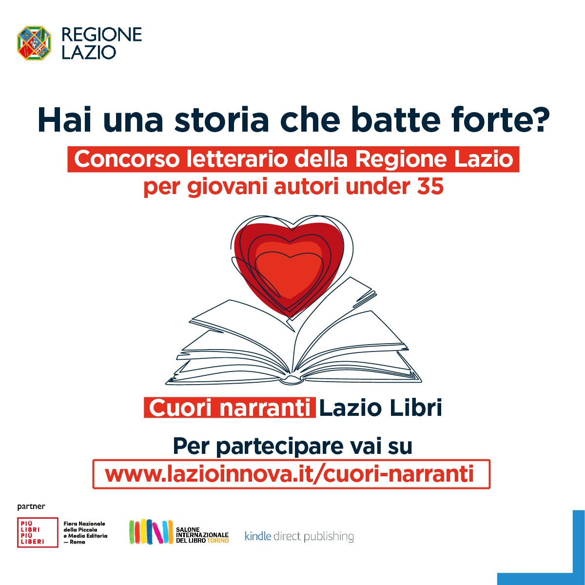 La Regione Lazio, attraverso Lazio Innova e nell’ambito del progetto “Lazio Libri”, annuncia il lancio del concorso letterario “Cuori narranti”, un’iniziativa rivolta a giovani autori tra i 14 e i 35 anni (non compiuti alla data di scadenza del bando), residenti o domiciliati nel territorio regionale. Partner dell’iniziativa: Più libri più liberi, Salone Internazionale del Libro di Torino e Amazon.